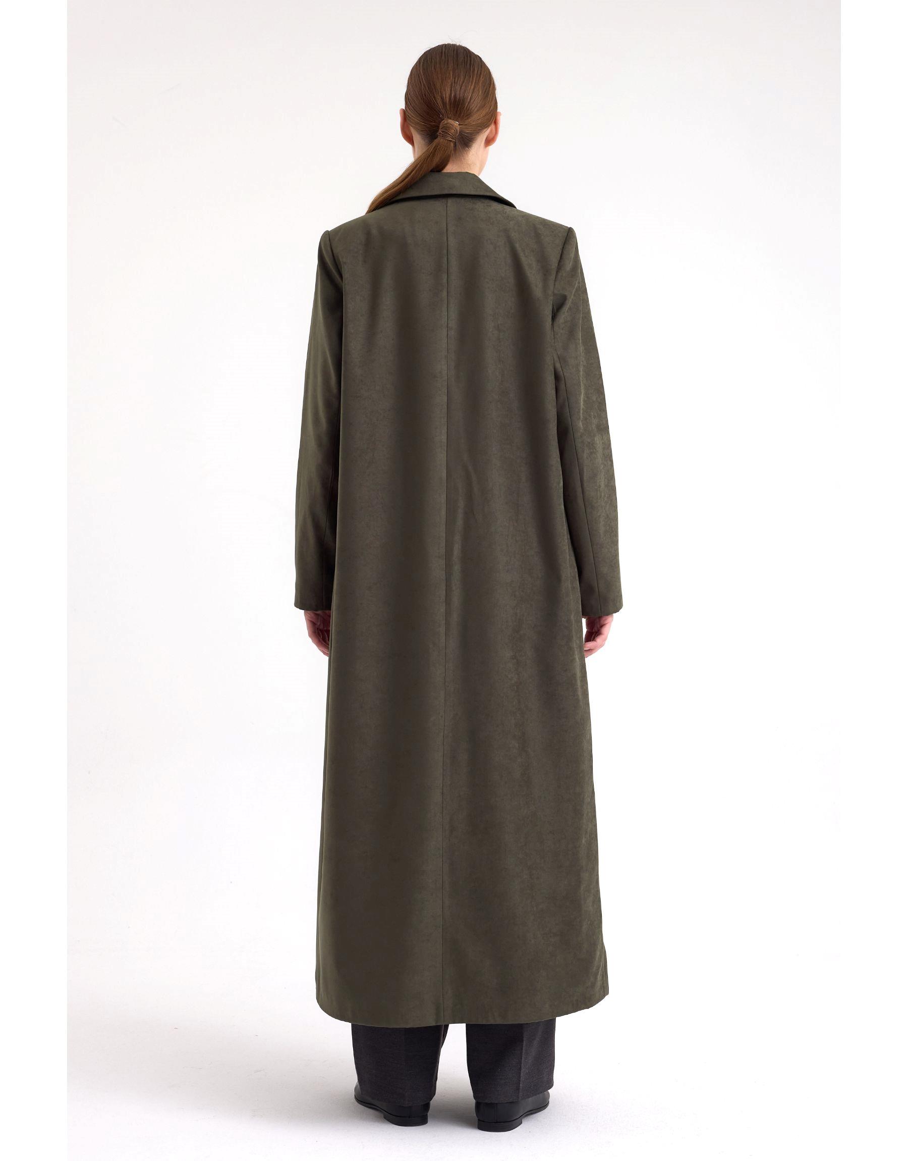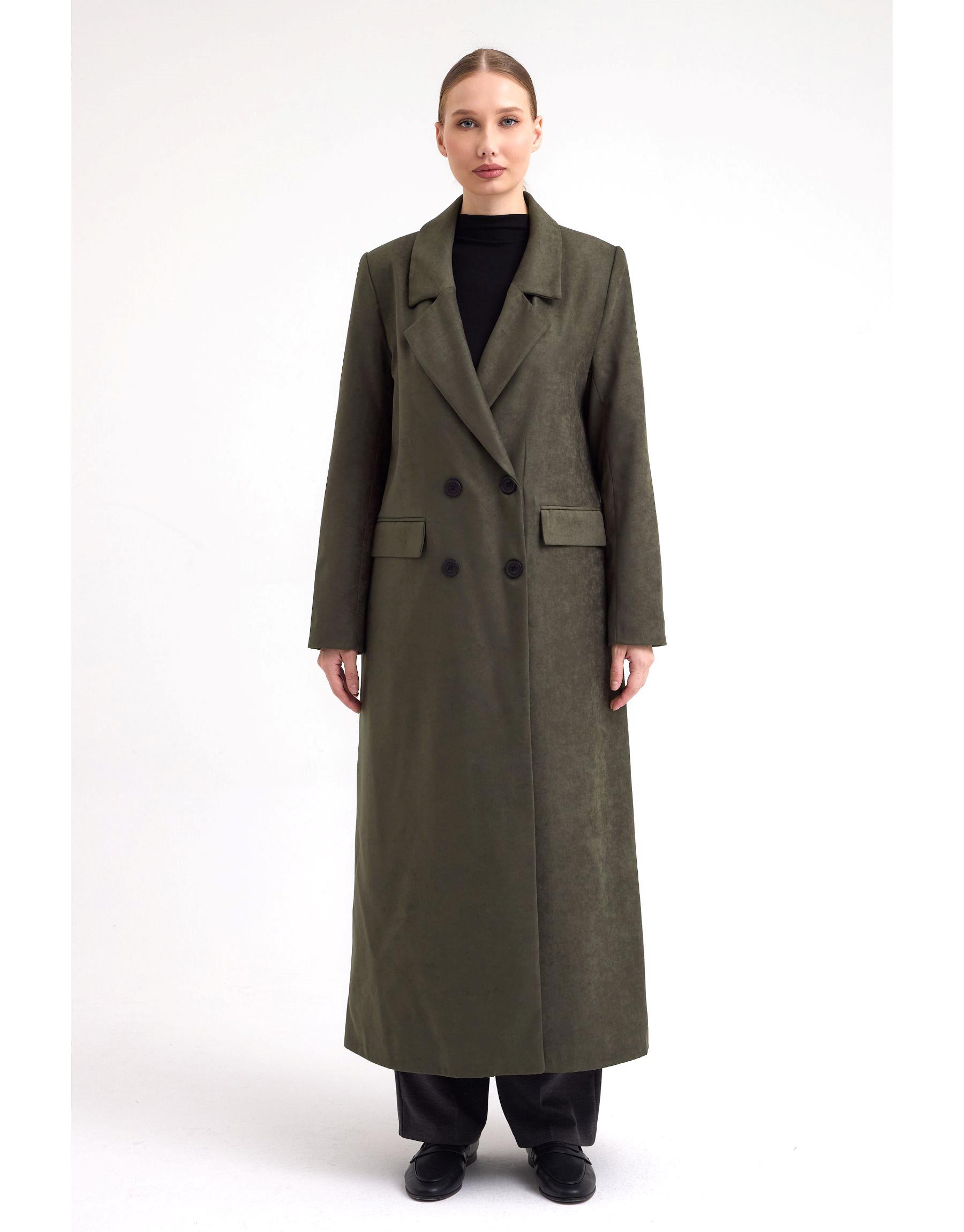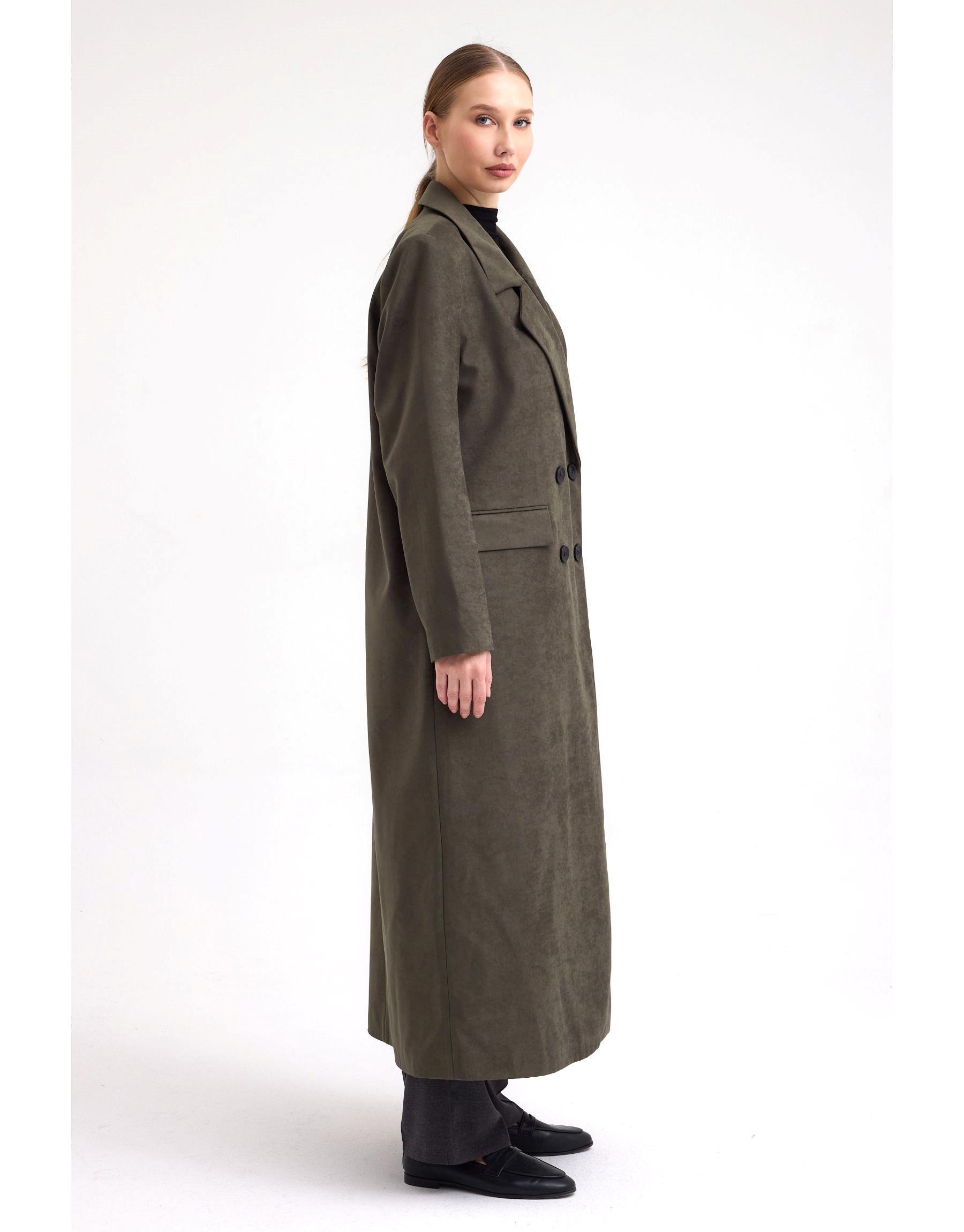 Dik yakası, belirgin omuz hattı ve çift sıra düğme detaylarıyla klasik kaban formuna modern bir yorum getirilmiştir. Uzun boyu sayesinde soğuk havalarda ekstra koruma sağlarken, süet dokulu yüzeyi ile sıcak ve şık bir kullanım sunar.