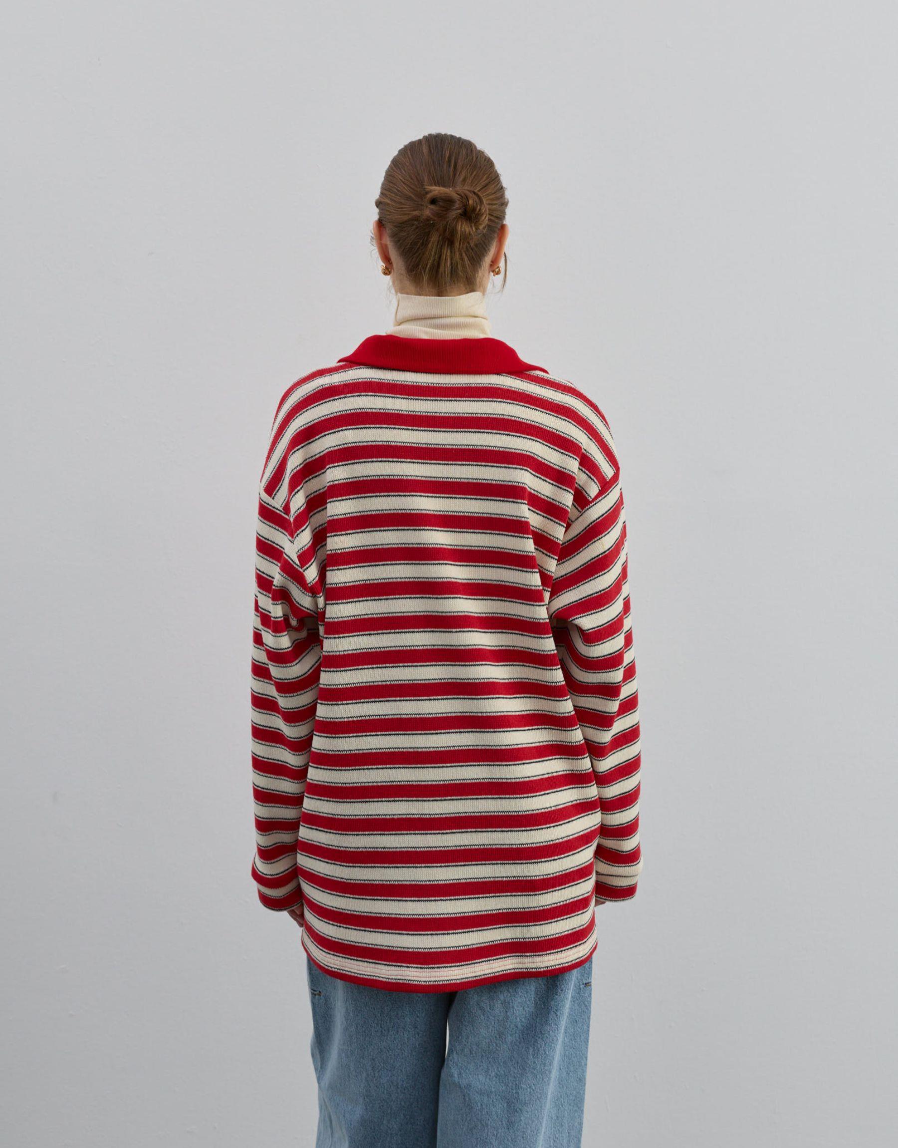 Polo yaka detayı ve oversize kalıbıyla hem sportif hem de casual bir tarz sunan bu kadın çizgili triko, şıklığı günlük kullanım rahatlığıyla buluşturur. Yeşil ve ekru tonlardaki çizgili deseni, modern ve dinamik bir görünüm yaratarak kombinlerinize taze bir hava katar.