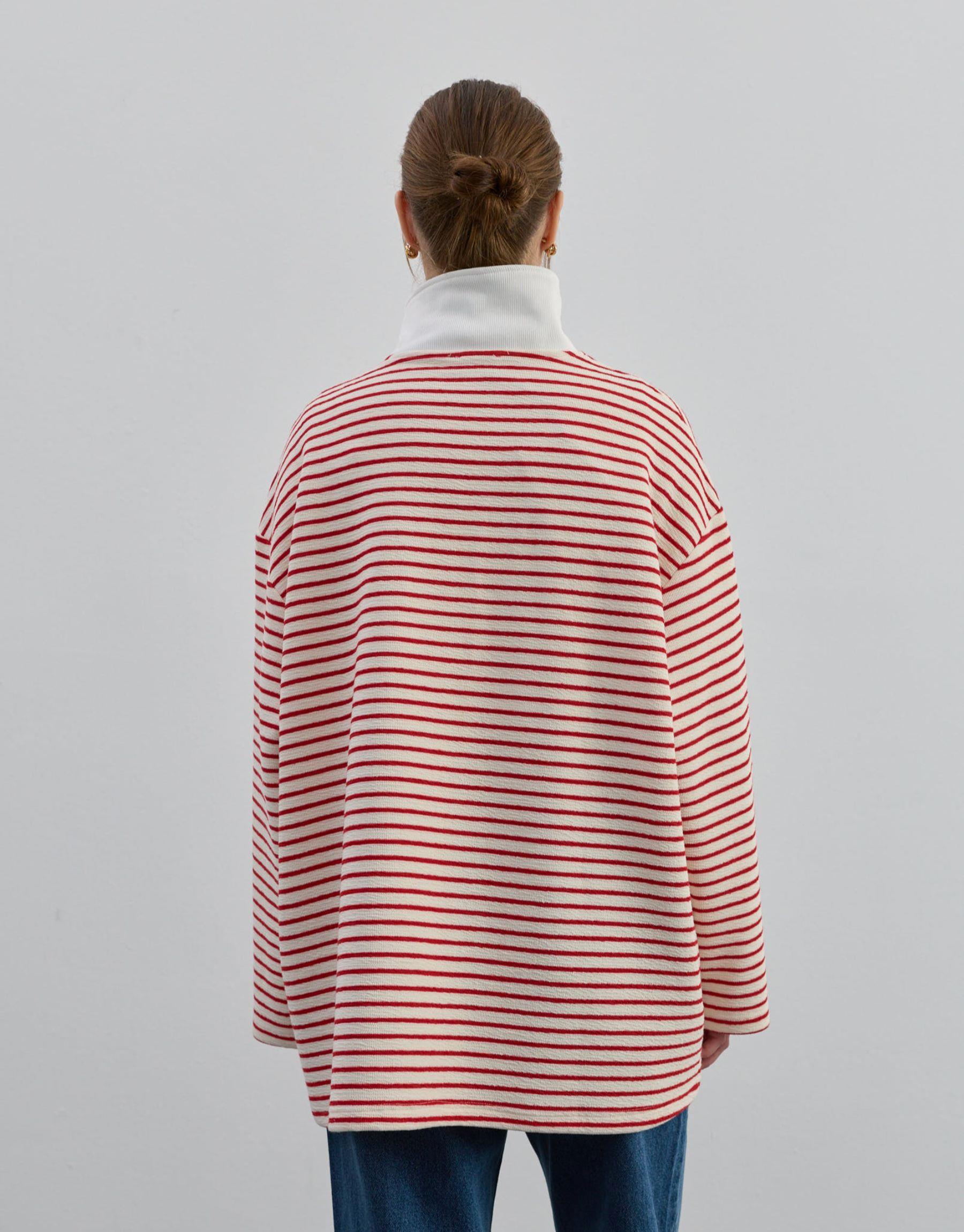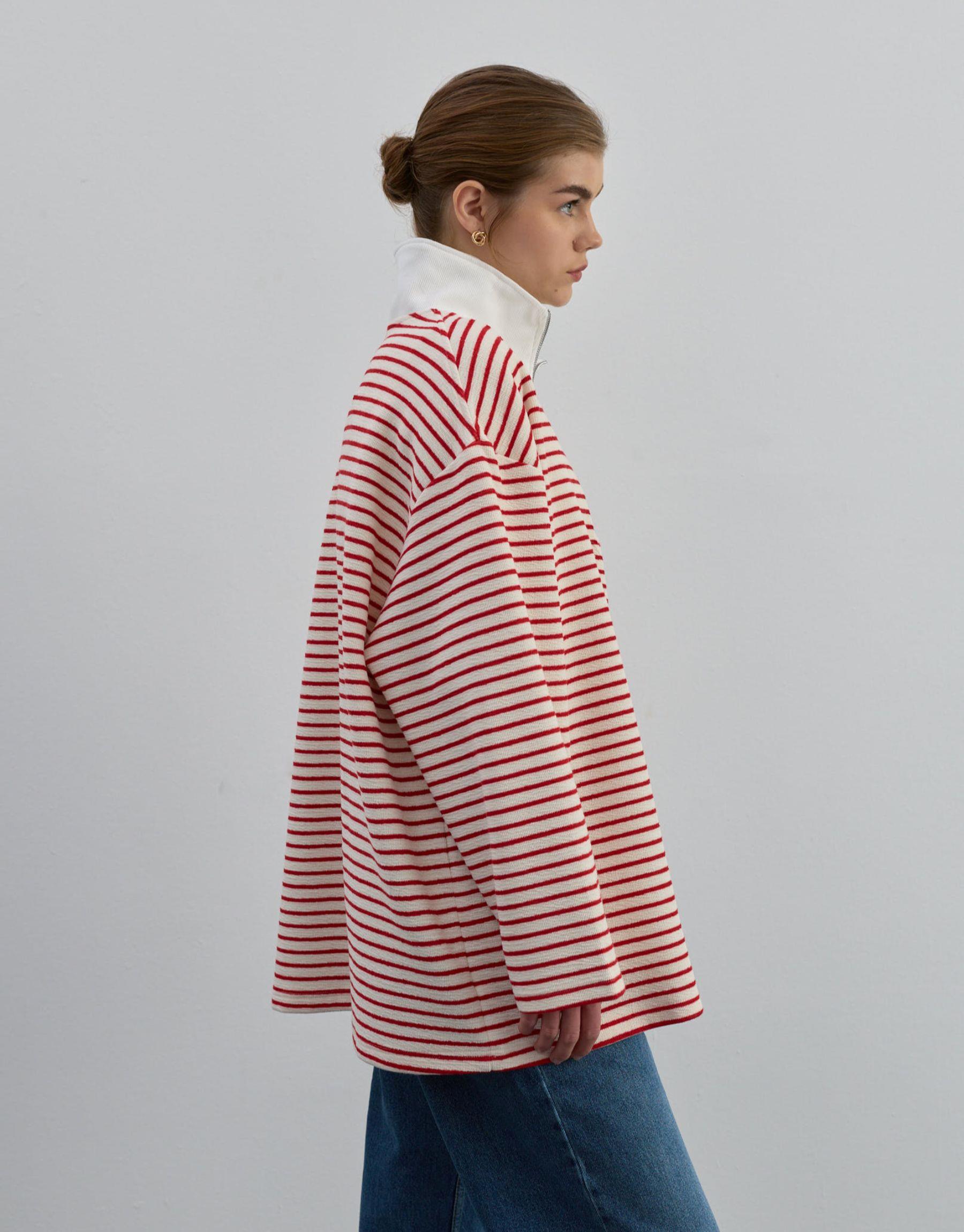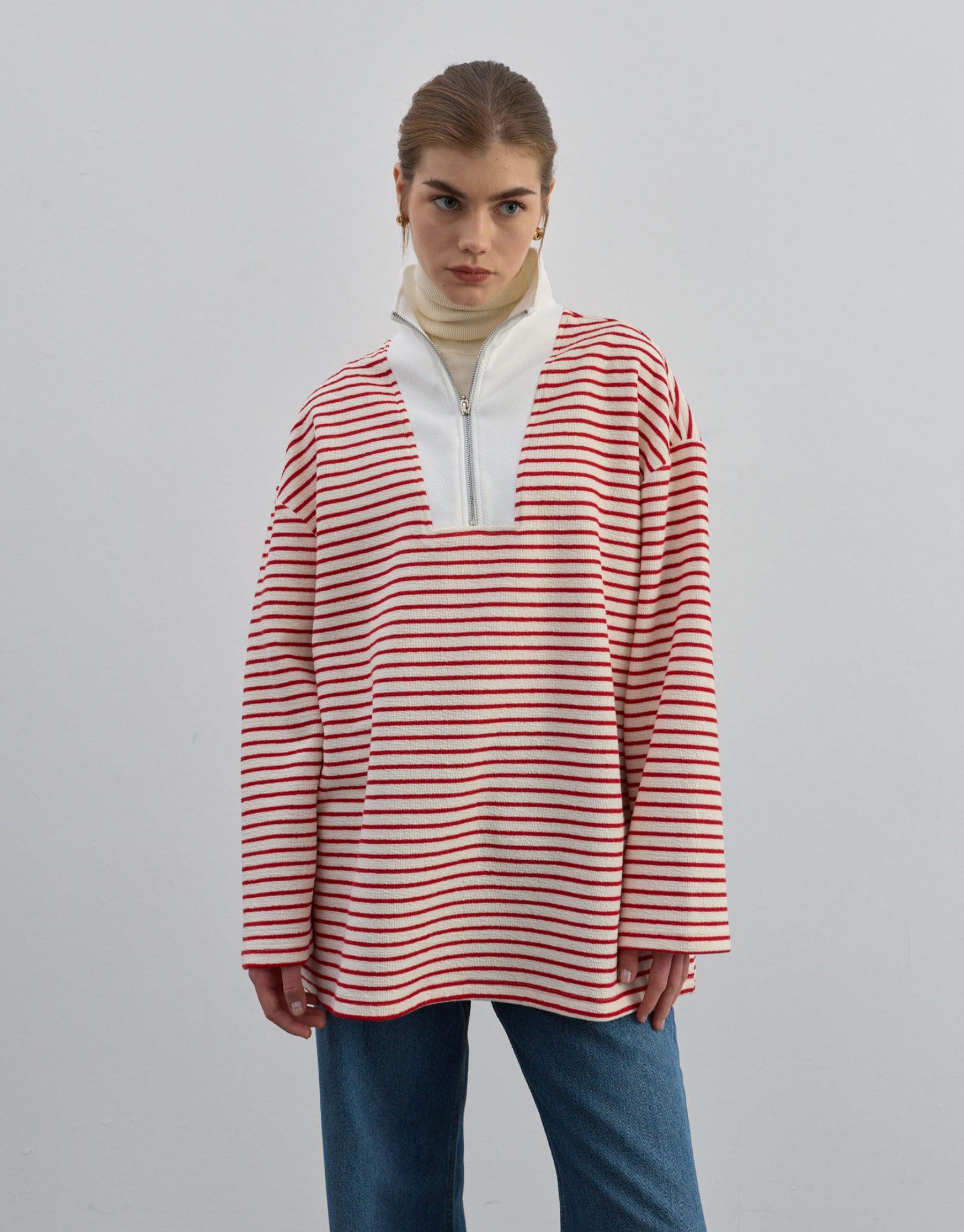 Rahatlığı ve şıklığı bir arada sunan bu fermuarlı sweatshirt, günlük stilin vazgeçilmez parçalarından biri olmaya aday. Doğal dokulu %100 pamuk kumaşı, nefes alabilen yapısıyla gün boyu konfor sağlar. Geniş kesimi ve sade çizgili deseniyle modern, minimal bir görünüm sunar.