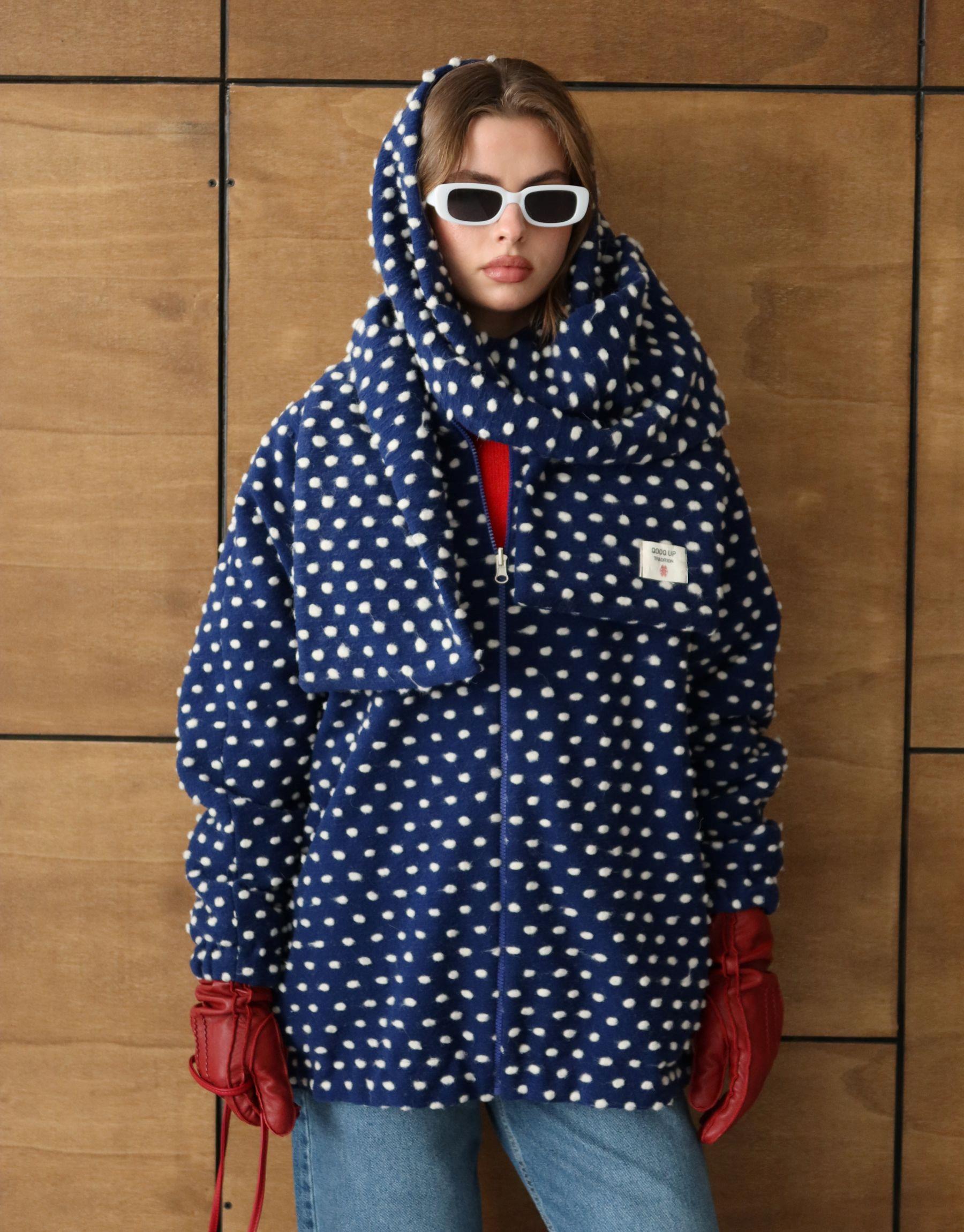 Lacivert zemin üzerindeki kontrast puantiye deseni, atkıya hareketli ama dengeli bir görünüm kazandırır. Günlük kombinlerden şehir stiline kadar geniş bir kullanım alanı sunan bu desenli atkı, kaban, mont ve triko kombinlerinin şık bir tamamlayıcısıdır.