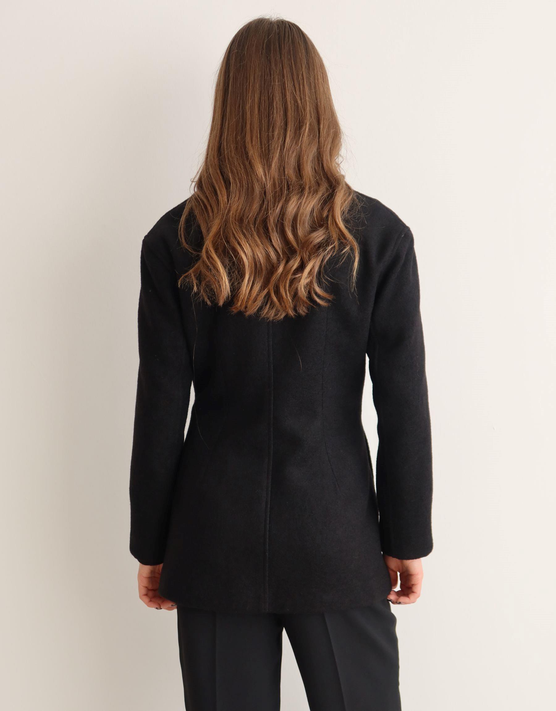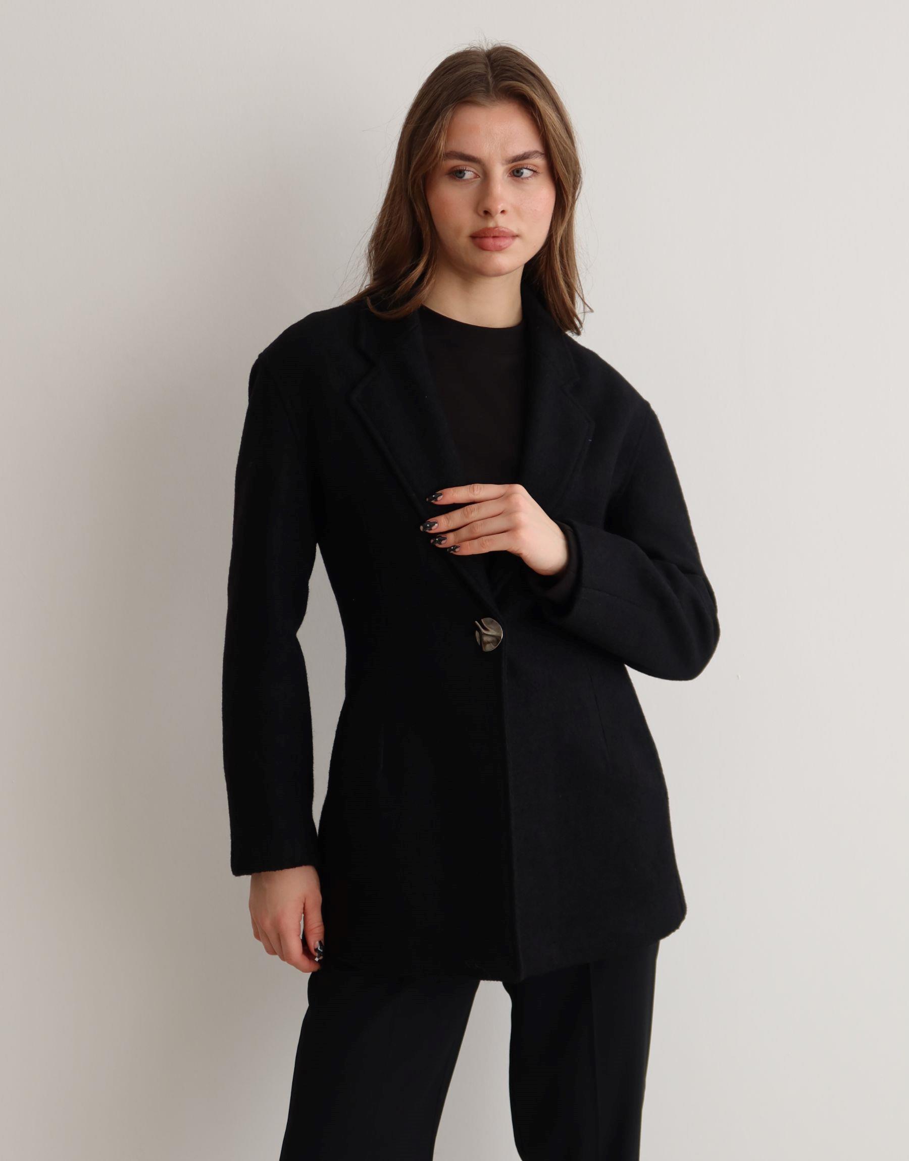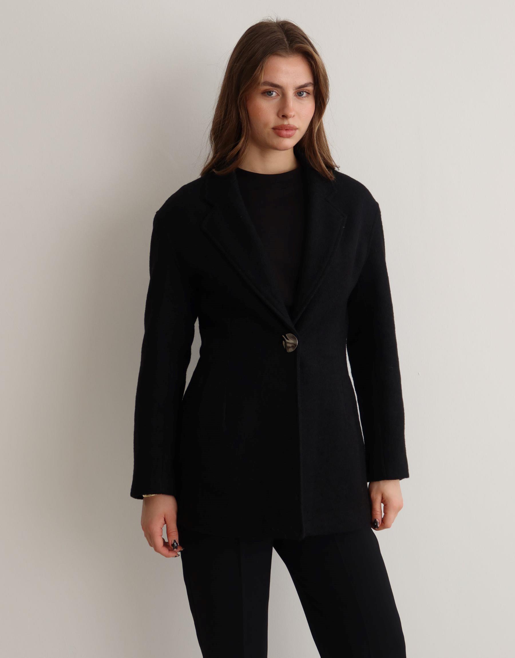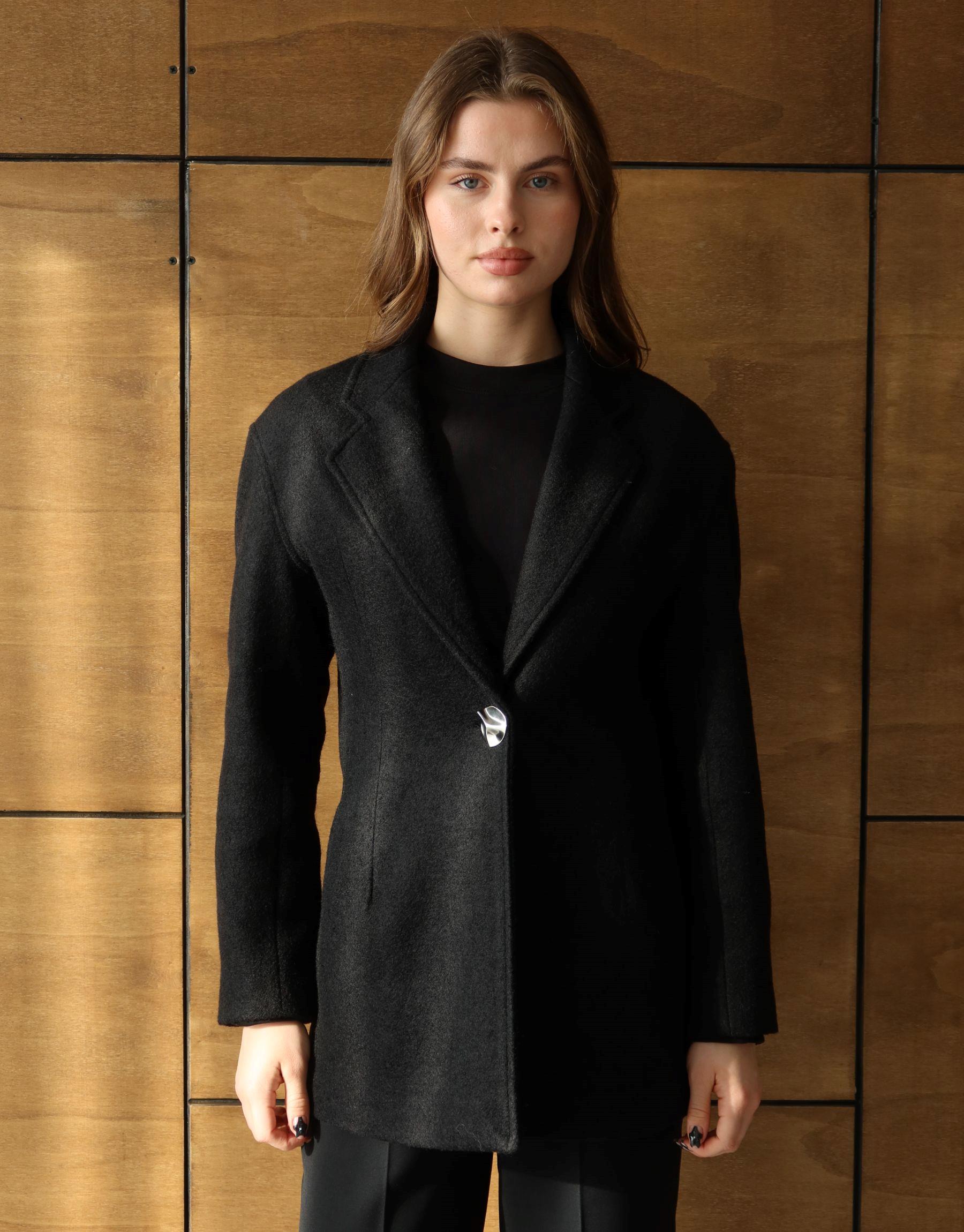 Klasik yaka formu ve tek düğme kapama detayı, cekete modern ve sofistike bir hava kazandırır. Günlük şehir stilinden ofis kombinlerine kadar geniş bir kullanım alanı sunan bu siyah kaşe ceket, pantolon, etek ve elbiselerle kolayca kombinlenebilir.
