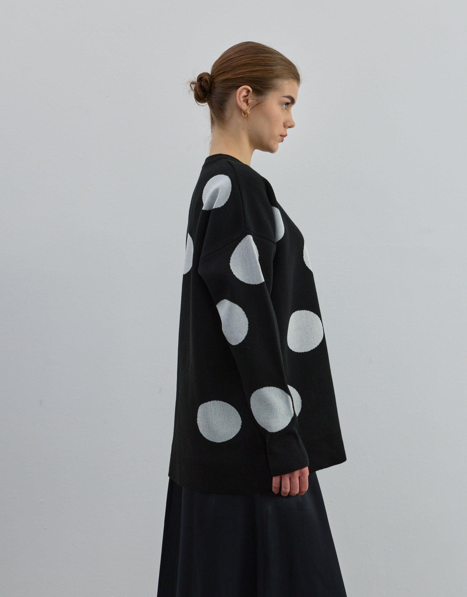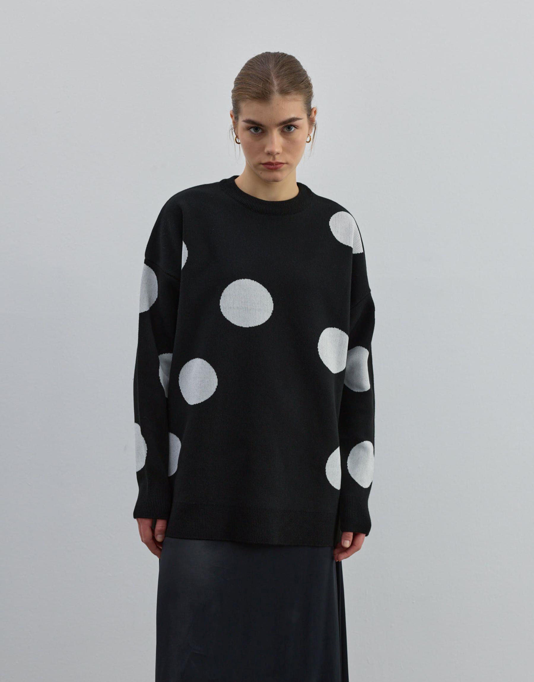 Siyah zemin üzerine yerleştirilmiş büyük beyaz puantiyeler, triko kazağa güçlü bir kontrast etkisi vererek şık ve enerjik bir görünüm yaratır. Soğuk havalarda sıcak tutan kalın dokusu, hem gün içinde hem de hafta sonu kombinlerinde ideal bir kullanım sunar. Etek, pantolon veya jeanlerle kolayca eşleşerek çok yönlü bir stil oluşturmanıza yardımcı olur.
